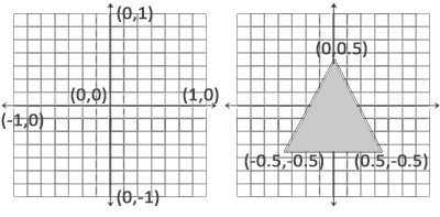 与通常的屏幕坐标不同,y轴正方向为向上,(0, 0)坐标是这个图像的中心,而不是左上角。最终你希望所有(变换过的)坐标都在这个坐标空间中,否则它们就不可见了。