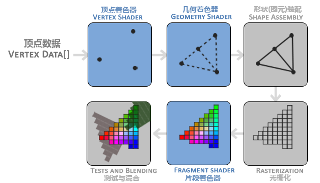 下面,你会看到一个图形渲染管线的每个阶段的抽象展示。要注意蓝色部分代表的是我们可以注入自定义的着色器的部分。