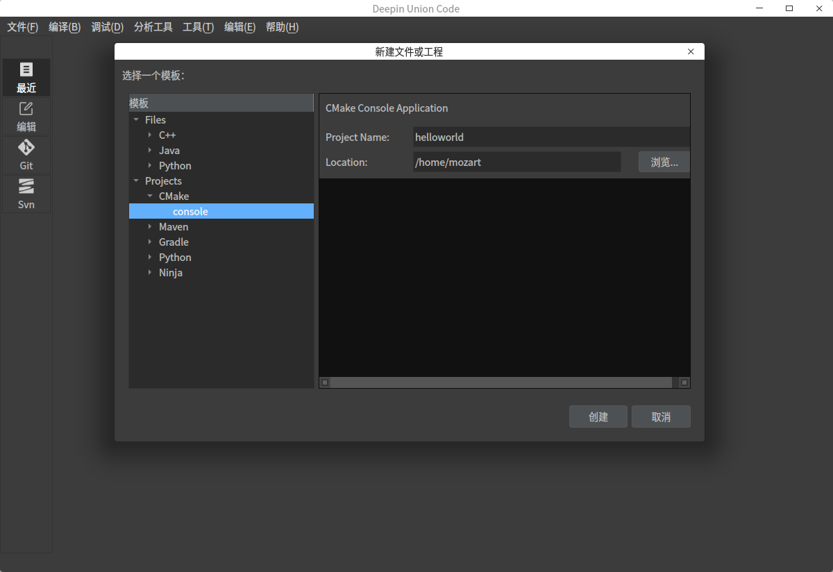 启动 deepin-unioncode,点击“文件”>"新建文件或工程">"弹出模板创建页面":