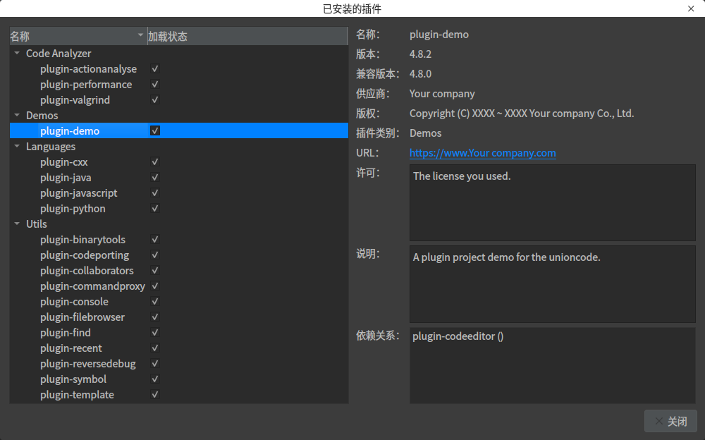 这里以 deepin-unioncode 自带的插件模板作为示例进行说明。
