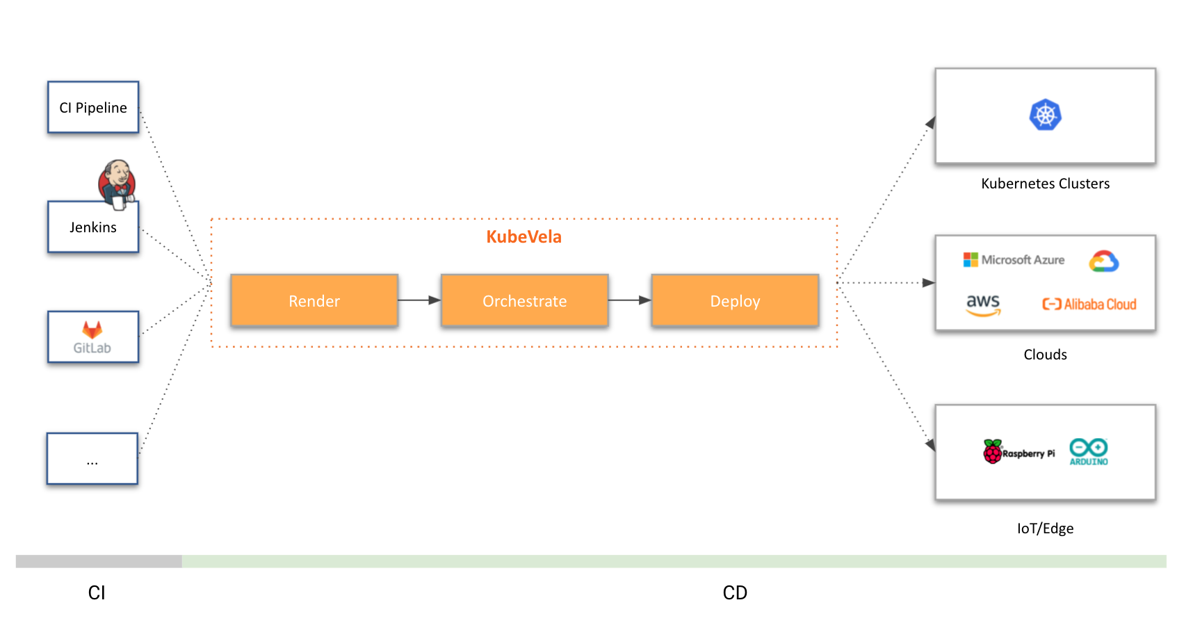 KubeVela practices the "render, orchestrate, deploy" workflow with below highlighted values added to existing ecosystem: