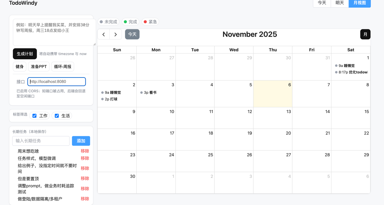 启动成功后,直接用浏览器打开 web/index.html,左侧输入自然语言,生成计划并在日历里查看。
