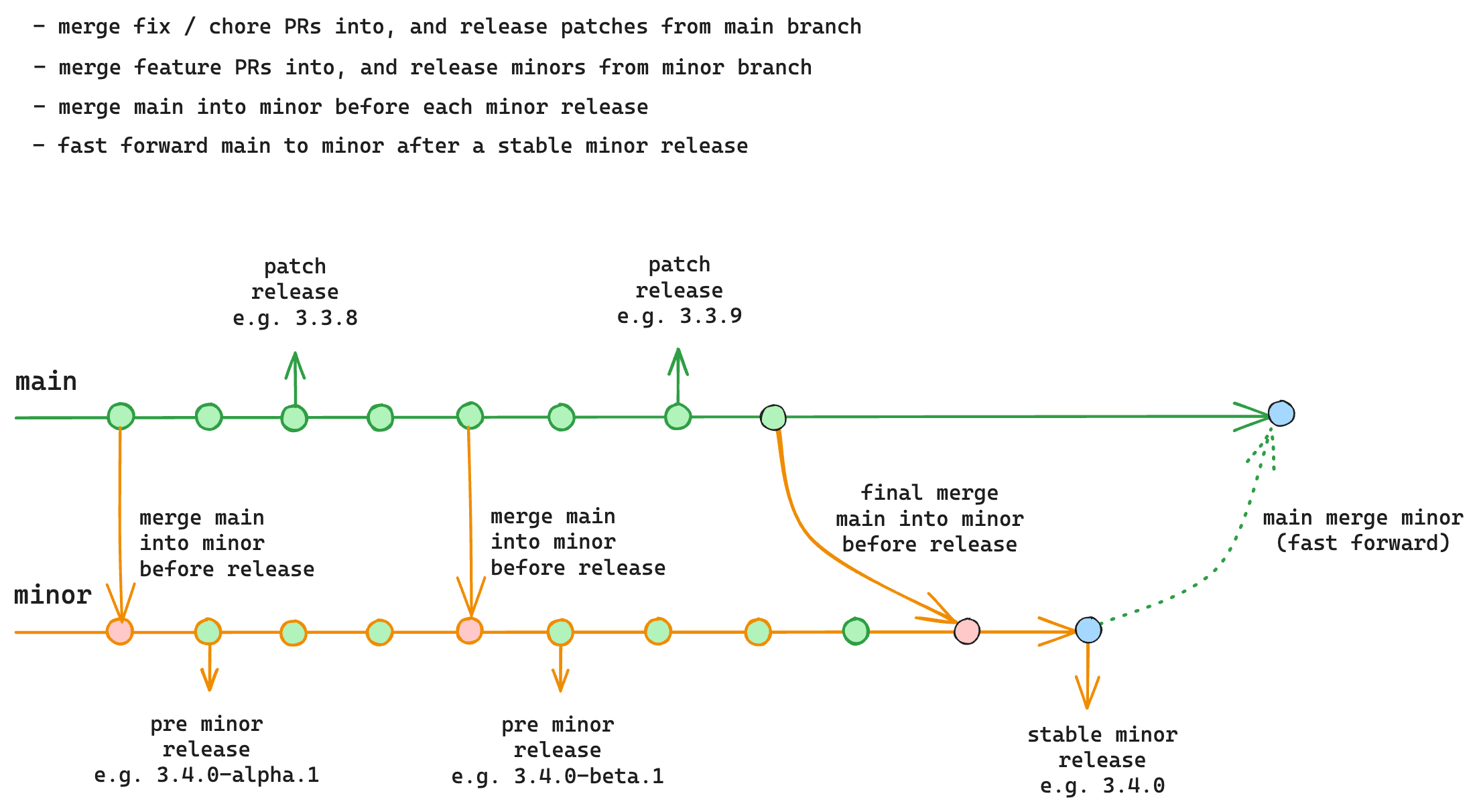When the minor is ready, we do a final merge of main into minor, and then release a stable minor from this branch (e.g. 3.4.0). After that, the main branch is fast-forwarded to the release commit, so the two branches are synced at each stable minor release.