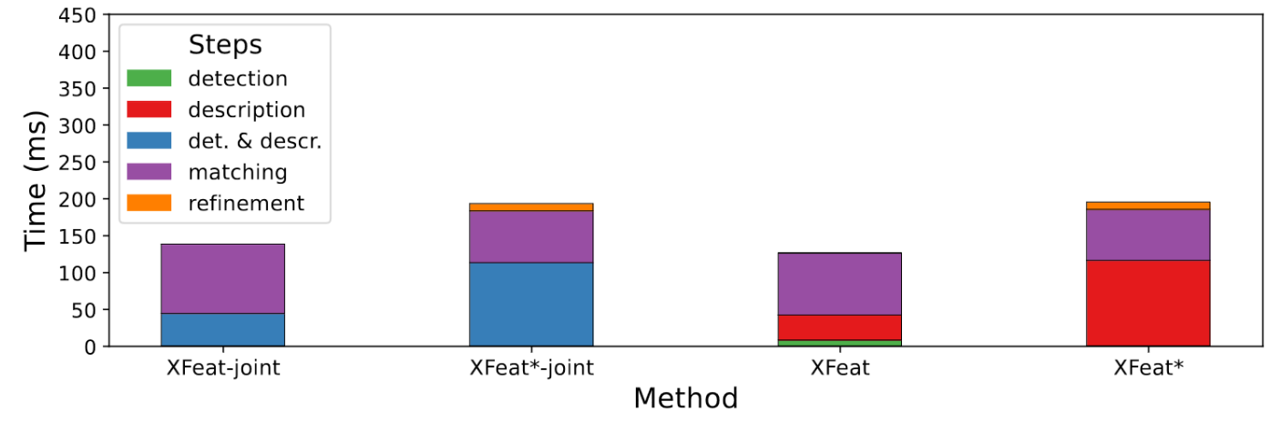 Paper Abstract. We introduce a lightweight and accurate architecture for resource-efficient visual correspondence. Our method, dubbed XFeat (Accelerated Features), revisits fundamental design choices in convolutional neural networks for detecting, extracting, and matching local features. Our new model satisfies a critical need for fast and robust algorithms suitable to resource-limited devices. In particular, accurate image matching requires sufficiently large image resolutions -- for this reason, we keep the resolution as large as possible while limiting the number of channels in the network. Besides, our model is designed to offer the choice of matching at the sparse or semi-dense levels, each of which may be more suitable for different downstream applications, such as visual navigation and augmented reality. Our model is the first to offer semi-dense matching efficiently, leveraging a novel match refinement module that relies on coarse local descriptors. XFeat is versatile and hardware-independent, surpassing current deep learning-based local features in speed (up to 5x faster) with comparable or better accuracy, proven in pose estimation and visual localization. We showcase it running in real-time on an inexpensive laptop CPU without specialized hardware optimizations.
